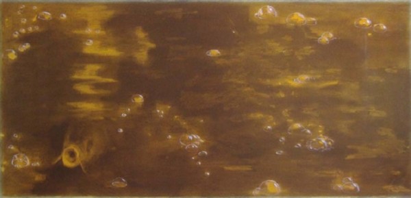 Uhel, křída, sprej pod rybniční fólií / Charcoal chalk spray under the fishpond board / 119 x 56 cm